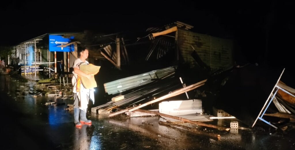 - Nhà cửa, hạ tầng: nhiều mái nhà bị tốc, cây xanh gãy đổ, bảng hiệu bị cuốn phăng, đường giao thông hư hại.